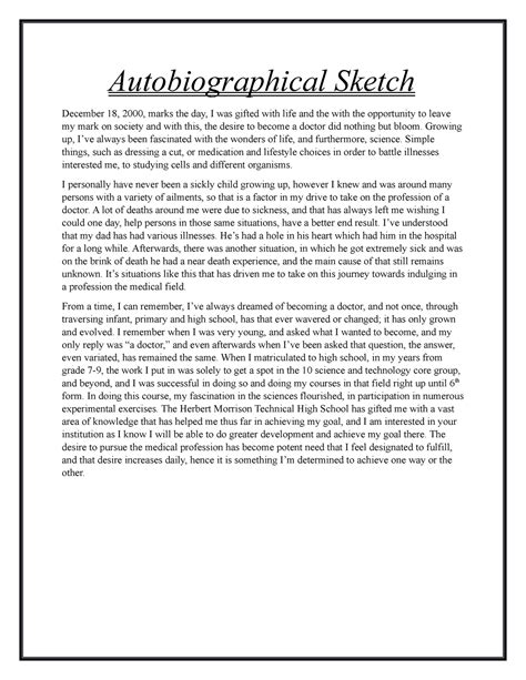 Autobiographical Sketch Examples - Writing an autobiographical sketch (also called a vignette) step one: The ontario medical school application service (omsas) autobiographical sketch (abs) is one of the few aspects of your medical school application that you can really customize to. Often, we need to create professional portfolios that include a resume, samples of professional work and a biographical sketch. Our team will guide.